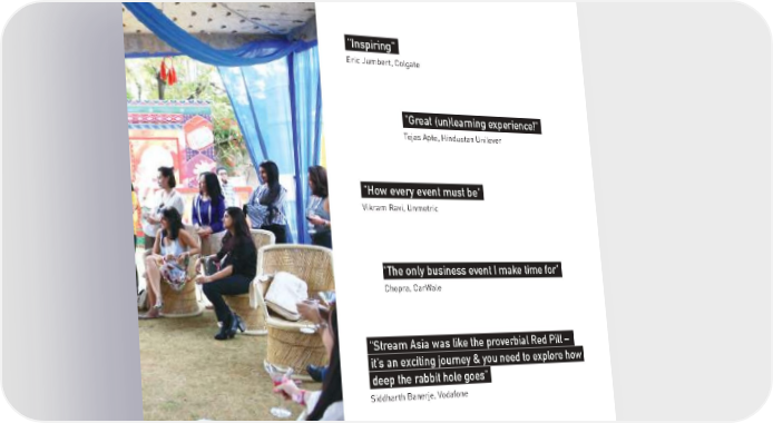 "Inspiring". Eric Jumbert, Colgate "Great (un)learning experience!". Tejas Apte, Hindustan Unilever "How every event must be". Vikram Ravi, Unmetric "The only business event I make time for". Chopra, CarWale "Stream Asia was like the proverbial Red Pill – . it’s an exciting journey & you need to explore how. deep the rabbit hole goes". Siddharth Banerje, Vodafone 55