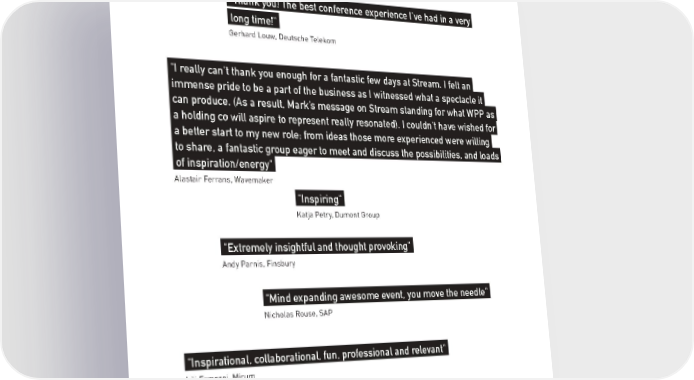 " Thank you! The best conference experience I’ve had in a very. long time!". Gerhard Louw, Deutsche Telekom " I really can’t thank you enough for a fantastic few days at Stream. I felt an. immense pride to be a part of the business as I witnessed what a spectacle it. can produce. (As a result, Mark’s message on Stream standing for what WPP as. a holding co will aspire to represent really resonated). I couldn’t have wished for. a better start to my new role; from ideas those more experienced were willing. to share, a fantastic group eager to meet and discuss the possibilities, and loads. of inspiration/energy". Alastair Ferrans, Wavemaker "Inspiring". Katja Petry, Dumont Group "Extremely insightful and thought provoking". Andy Parnis, Finsbury "Mind expanding awesome event, you move the needle". Nicholas Rouse, SAP "Inspirational, collaborational, fun, professional and relevant". Lili Ermezei, Mirum 85
