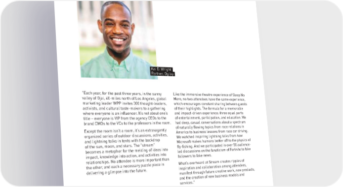 Kai D. Wright- Partner, Ogilvy- "Each year, for the past three years, in the sunny Like the immersive theatre experience of Sleep No valley of Ojai, 40-miles north of Los Angeles, global More, no two attendees have the same experience, marketing leader WPP invites 300 thought-leaders, which encourages constant sharing between guests activists, and cultural taste-makers to a gathering of their highlights. The formula for a memorable where everyone is an influencer. It’s not about one’s and impact-driven experience: three equal parts title – everyone is VIP from the agency CEOs to the of entertainment, participation, and education. We brand CMOs to the VCs to the professors in the room. had deep, casual conversations about a spectrum Except the room isn’t a room, it’s an extravagantly of naturally flowing topics from race relations in organized series of outdoor discussions, activities, America to business lessons from race car driving. and lightning talks in tents with the backdrop We watched inspiring lightning talks from how of the sun, moon, and stars. The "stream" Microsoft makes humans better off to the physics of becomes a metaphor for the melding of ideas into fly-fishing. And we participated in over 50 audience- impact, knowledge into action, and activities into led discussions on the fanaticism of Fortnite to fake relationships. No attendee is more important than followers to fake news. the other, and each a necessary puzzle piece in What’s overheard at Stream creates ripples of delivering a glimpse into the future. inspiration and collaboration among attendees, manifest through future creative work, new products, and the creation of new business models and services." 8