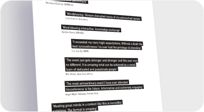 "Stream is the new benchmark". Nicholas Duminy, SABMiller "Mindblowing. Stream disrupted many of my entrenched beliefs". Lida Sinclair, Discovery "Mind blowing interactive, knowledge exchange". Gordon Henry, ABInBev "It exceeded my (very high) expectations. Without a doubt the. best (un)conference I’ve ever had the privilege of attending". Lizl van Zyl, BMW "The event just gets stronger and stronger and this year was. no different. It is amazing what can be achieved by a small. team of dedicated and passionate people". Will Green, Apurimac Africa "The most extraordinary event I have ever attended.. Unconference is the future. Informative and extremely engaging". Angel Myeni Katusya, Simba Corp "Meeting great minds in a context like this is incredibly.. satisfying. The format is amazing". Benjamin Schoderer, Yum (KFC) 47