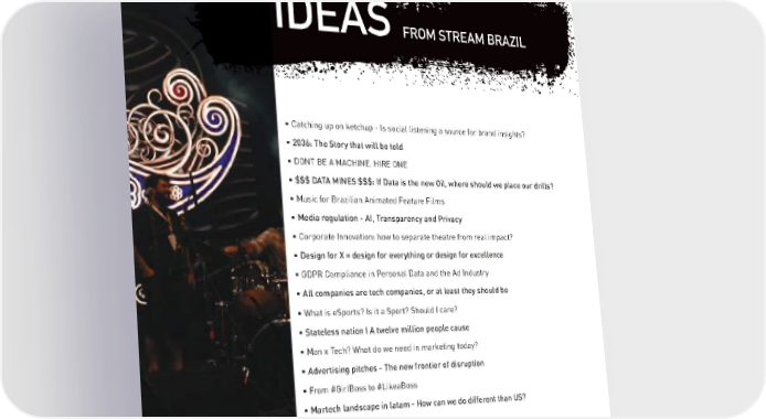 IDEAS FROM STREAM BRAZIL • Catching up on ketchup - Is social listening a source for brand insights? • 2036: The Story that will be told • DONT BE A MACHINE. HIRE ONE • $$$ DATA MINES $$$: If Data is the new Oil, where should we place our drills? • Music for Brazilian Animated Feature Films • Media regulation - AI, Transparency and Privacy • Corporate Innovation: how to separate theatre from real impact? • Design for X = design for everything or design for excellence • GDPR Compliance in Personal Data and the Ad Industry • All companies are tech companies, or at least they should be • What is eSports? Is it a Sport? Should I care? • Stateless nation I A twelve million people cause • Man x Tech? What do we need in marketing today? • Advertising pitches - The new frontier of disruption • From #GirlBoss to #LikeaBoss • Martech landscape in latam - How can we do different than US? • Finding phone life balance 35