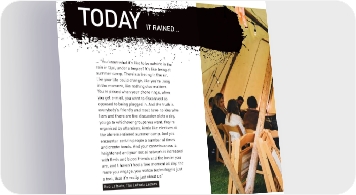 TODAY IT RAINED... ... "You know what it's like to be outside in the rain in Ojai, under a teepee? It's like being at summer camp. There's a feeling in the air, like your life could change, like you're living in the moment, like nothing else matters. You're pissed when your phone rings, when you get e-mail, you want to disconnect as opposed to being plugged in. And the truth is everybody's friendly and most have no idea who I am and there are five discussion slots a day, you go to whichever groups you want, they're organized by attendees, kinda like electives at the aforementioned summer camp. And you encounter certain people a number of times and create bonds. And your consciousness is heightened and your social network is increased with flesh and blood friends and the busier you are, and I haven't had a free moment all day, the more you engage, you realize technology is just a tool, that it's really just about us" Bob Lefsetz, The Lefsetz Letters- 10