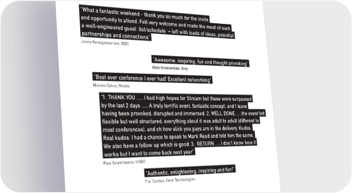 "What a fantastic weekend - thank you so much for the invite. and opportunity to attend. Felt very welcome and made the most of such. a well-engineered guest list/schedule – left with loads of ideas, potential. partnerships and connections". Jonny Kanagasooriam, BBC "Awesome, inspiring, fun and thought provoking". Alain Groenendale, Grey "Best ever conference I ever had! Excellent networking". Monika Szkva, Nestle " 1. THANK YOU …. I had high hopes for Stream but these were surpassed. by the last 2 days …. A truly terrific event, fantastic concept, and I leave. having been provoked, disrupted and immersed. 2. WELL DONE … the event felt. flexible but well structured, everything about it was adult to adult (different to. most conferences), and oh how slick you guys are in the delivery. Kudos.. Real kudos. I had a chance to speak to Mark Read and told him the same.. We also have a follow up which is good. 3. RETURN … I don’t know how it. works but I want to come back next year". Paul Szumilewicz, HSBC "Authentic, enlightening, inspiring and fun!". Tim Corden, Here Technologies 90