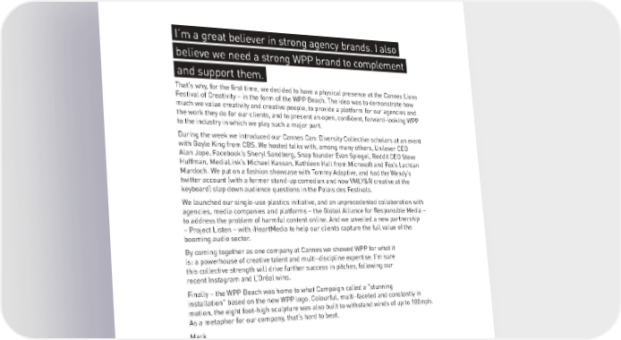 I’m a great believer in strong agency brands. I also. believe we need a strong WPP brand to complement. and support them.. That’s why, for the first time, we decided to have a physical presence at the Cannes Lions Festival of Creativity – in the form of the WPP Beach. The idea was to demonstrate how much we value creativity and creative people, to provide a platform for our agencies and the work they do for our clients, and to present an open, confident, forward-looking WPP to the industry in which we play such a major part. During the week we introduced our Cannes Can: Diversity Collective scholars at an event with Gayle King from CBS. We hosted talks with, among many others, Unilever CEO Alan Jope, Facebook’s Sheryl Sandberg, Snap founder Evan Spiegel, Reddit CEO Steve Huffman, MediaLink’s Michael Kassan, Kathleen Hall from Microsoft and Fox’s Lachlan Murdoch. We put on a fashion showcase with Tommy Adaptive, and had the Wendy’s twitter account (with a former stand-up comedian and now VMLY&R creative at the keyboard) slap down audience questions in the Palais des Festivals. We launched our single-use plastics initiative, and an unprecedented collaboration with agencies, media companies and platforms – the Global Alliance for Responsible Media – to address the problem of harmful content online. And we unveiled a new partnership – Project Listen – with iHeartMedia to help our clients capture the full value of the booming audio sector. By coming together as one company at Cannes we showed WPP for what it is: a powerhouse of creative talent and multi-discipline expertise. I’m sure this collective strength will drive further success in pitches, following our recent Instagram and L’Oréal wins. Finally – the WPP Beach was home to what Campaign called a "stunning installation" based on the new WPP logo. Colourful, multi-faceted and constantly in motion, the eight foot-high sculpture was also built to withstand winds of up to 100mph. As a metaphor for our company, that’s hard to beat. Mark 113