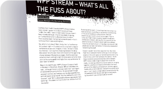 WPP STREAM – WHAT’S ALL THE FUSS ABOUT? Alice ter Haar. Senior Manager-EU Marketing, Deliveroo. I confess that I hadn’t heard of WPP’s Stream before As we board the coach, I’m starting to feel that school trip- I was invited. I guess it’s kind of like one of those style excitement, butterflies in my stomach accompanying "under the radar," cool-in-town spots that you haven’t a mixture of trepidation and excitement. Because been introduced to yet. The bill sounded intriguing; essentially, you’re with a bunch of strangers. If you’re an "(un)conference for (un)conventional thinkers". lucky, you might know a couple of people through your That could’ve been marketing buzzword speak — but it professional network, dahling. But this scenario has the turns out that it was anything but… potential to be an introvert’s worst nightmare and even So, what’s it all about? Well, firstly, the "un"conference make the extroverts blush — three days non-stop with 360 bit is about right — it’s about as far a cry from a regular people you’ve never met before. It’s basically a weekend of conference as you can imagine. In fact, I’d liken it more networking (bleurgh). to a festival. I can say that choosing between the daily Except it couldn’t be farther away from that. Yes, there discussion forums was more reminiscent of the agonising might be an awkward moment when you’re not talking to choice between Glastonbury stages. And the evening’s anyone in the lunch queue, or something that smelt a tiny entertainment and light-night finishes were certainly more little bit like a pitch from someone. But overall, I found akin to the same good time highs than any conference I’d those moments to be extremely few and far between. ever been to before. WPP invites a wide range of people from across the Now in its twelfth year, WPP’s Stream Europe is held media, marketing and communication spectrum, bringing in October in Marathon, Greece. 80% of attendees are together a plethora of movers-and-shakers from each new… although there’s a strong "old-timer" contingent corner of the industry; entrepreneurs, activists, agency of seasoned pro party faithful. As we walked through heads and us client-side folk. Everyone has something to passport control, we newbies are like doe-eyed Bambis, say — I can’t recall a single tedious conversation during with whispers to be heard "that the bedrooms aren’t the the weekend. And, boy, you soon get to know people… fanciest" and "WiFi is disabled to discourage people from by the end of it you are best buds (of course!). working". This does turn out to be true. And so much for the better. 2