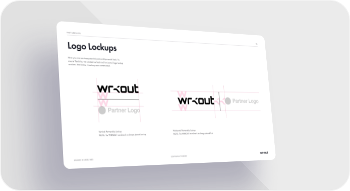 PARTNERSHIPS 113 Logo Lockups Here you can see how potential partnerships would look. To ensure flexibility, we created vertical and horizontal logo lockup versions. See below, how they were constructed. Vertical Partnership Lockup Horizontal Partnership Lockup NOTE: The WRKOUT wordmark is always placed on top NOTE: The WRKOUT wordmark is always placed first BRAND GUIDELINES COPYRIGHT ©2020