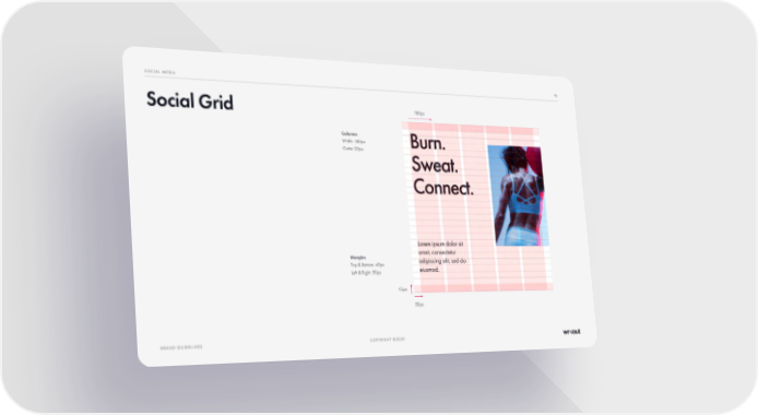 Wrkout Brand Book Page 92 Page 94SOCIAL MEDIA 93 Social Grid 180px Columns Width: 180px Gutter 20px Margins Top & Bottom: 45px Left & Right: 50px 45px 50px BRAND GUIDELINES COPYRIGHT ©2020