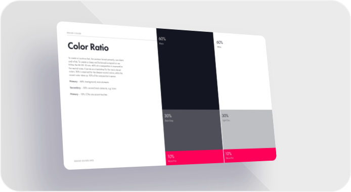 BRAND COLOR 60% 60% Black White Color Ratio To create a luxurious feel, the workout brand primarily uses black and white. To create a classy and balanced composition we follow the 60-30-10 rule. 60% of a composition is reserved for the neutral tones. It serves as a backdrop for the more vibrant colors. 30% is reserved for the deeper neutral colors, while the accent color takes up 10% of the composition’s space. Primary – 60%: background, main elements Secondary – 30%: second level elements, e.g. Icons Primary – 10%: CTAs ans accent touches 30% 30% Dark Gray Light Gray 10% 10% BRAND GUIDELINES COPYRIGHT ©2020 Warm Pink Warm Pink
