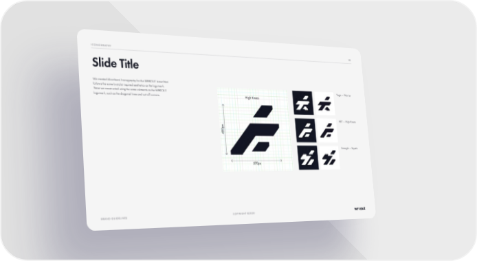 ICONOGRAPHY 145 Slide Title We created directional iconography for the WRKOUT brand that follows the same brutalist inspired aesthetics as the logomark. Yoga — Warrior These we constructed using the same elements as the WRKOUT logomark, such as the diagonal lines and cut-off corners. HIIT — High Knees Strength — Squats BRAND GUIDELINES COPYRIGHT ©2020