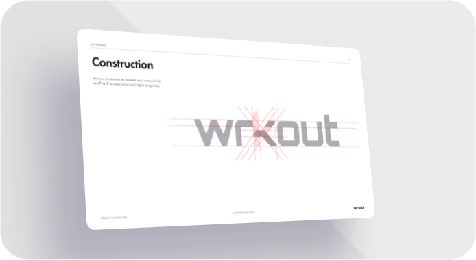 Wrkout Brand Book Page 5 Page 7COPYRIGHT ©2020 Here you can see how the wordmark was constructed. We cut off the ‘K' to create a mark that is highly recognizable. Construction WORDMARK BRAND GUIDELINES 6