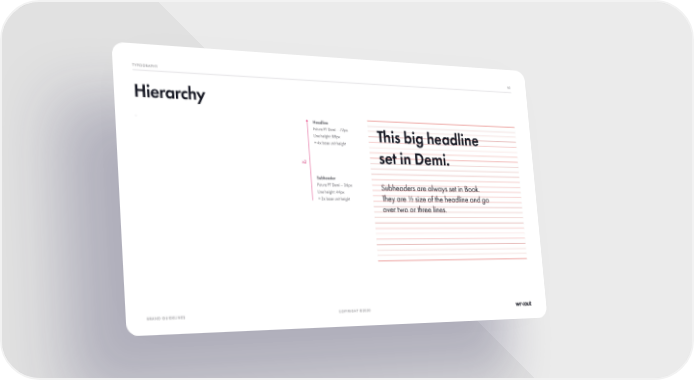 COPYRIGHT ©2020 - Hierarchy TYPOGRAPHY BRAND GUIDELINES 63 Headline Futura PT Demi – 72px Line height: 88px = 4x base unit height Subheader Futura PT Demi – 36px Line height: 44px = 2x base unit height x2 Subheaders are always set in Book. The y a re ½ size of the headline and go over two or three lines. This big headline set in Demi.