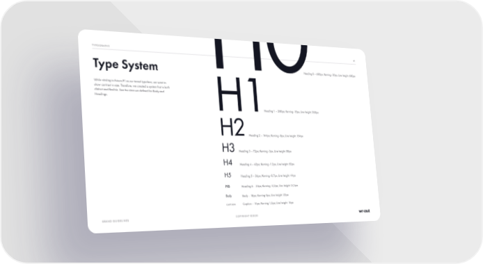 COPYRIGHT ©2020 While sticking to Futura PT as our brand typeface, we want to show contrast in size. Therefore, we created a system that is both distinct and flexible. See the sizes we defined for Body and Headings. Type System TYPOGRAPHY BRAND GUIDELINES 61 Heading 0 – 600px; Kerning -30px, Line height: 600px Heading 1 – 288px; Kerning -15px, Line height: 308px Heading 2 – 144px; Kerning -8px, Line height: 154px Heading 3 – 72px; Kerning -3px, Line height: 88px Heading 4 – 42px; Kerning -1.2px, Line height: 52px Heading 5 – 36px; Kerning -0,7px, Line height: 44px Heading 6 – 24px; Kerning -0,2px, Line height: 27,5px Body – 18px; Kerning 0px, Line height: 22px Caption – 14px; Kerning 1,5px; Line height: 16px