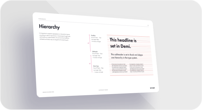 COPYRIGHT ©2020 It is important to organize typography in a hierarchical system according to relative importance or inclusiveness through scale and function on communication. You can see how headlines, subheads and body copy are aligned to the baseline grid. Hierarchy TYPOGRAPHY BRAND GUIDELINES 62 This headline is set in Demi. Th i s s u b he a d e r i s s e t i n B o o k a n d s k i p p s one hierarchy in the type system. At vero eos et accusamus et iusto odio dignissimos ducimus qui blandi- tiis praesentium voluptatum deleniti atque corrupti quos dolores et quas. At vero eos et accusamus et iusto odio dignissimos ducimus qui blandi- tiis praesentium voluptatum deleniti atque corrupti quos dolores et quas. At vero eos et accusamus et iusto odio dignissimos ducimus qui blandi- tiis praesentium voluptatum deleniti atque corrupti quos dolores et quas. Headline Futura PT Demi – 72px Line height: 88px = 4x base unit height Subheader Futura PT Book – 36px Line height: 44px = 2x base unit height Body Copy Futura PT Book – 18px Line height: 22px = 1x base unit height x2 x2