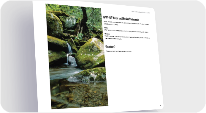 WWF-US Print Brand Guidelines 2012 WWF-US Vision and Mission Statements When using these statements on publications, be sure to use the most current, official versions (below). Vision WWF’s vision is to build a future in which people live in harmony with nature. Mission WWF’s mission is to conserve nature and reduce the most pressing threats to the diversity of life on Earth. Questions? Please contact the Creative Services team. 16