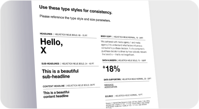 Typography Use these type styles for consistency. Please reference the type style and size parameters. HEADLINES | HELVETICA NEUE BOLD, 60 - 75 PT BODY COPY | HELVETICA NEUE NORMAL, 18 - 24PT We partnered with media agency 1 and media agency 2 to understand what factors inüuence a Hello, consumer’s purchase decision. ¼ of a consumer’s purchase decision is driven by how culturally relevant X the brand is -- that is not insigniûcant. DATA NUMBERS | HELVETICA NEUE BOLD, 75 - 100PT SUB-HEADLINES | HELVETICA NEUE BOLD, 24 - 40 PT + 18% This is a beautiful sub-headline DATA SUPPORTING | HELVETICA NEUE NORMAL, 20 - 22PT CONTENT HEADLINE | HELVETICA NEUE BOLD, 28 PT MESSAGE ASSOCIATION This is a beautiful content headline SOURCE | HELVETICA NEUE NORMAL, 16 PT Source: X Internal Data (Semantic Core). US Only. Graph: 7-day rolling average post volume, 4/1/23 – 7/17/23. Growth Metric: Daily average post growth month over month, 6/1/23 – 7/17/23. Data retrieved 7/17/23. If you are already using Chirp font, you may continue to use it until a revised version of the brand guidelines is released with a custom toolkit. 6