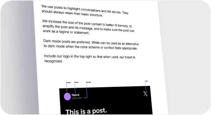 Posts We use posts to highlight conversations and tell stories. They should always retain their basic structure. We increase the size of the post content to better fit formats, to amplify the post and its message, and to make sure the post can work as a tagline or statement. Dark mode posts are preferred. White can be used as an alternative to dark mode when the color scheme or context feels appropriate. Include our logo in the top right so that when used, our brand is recognized. 8