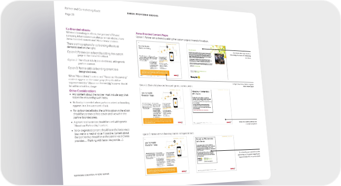 Partner and Co-marketing Guide Xerox PROVIDED EBOOKS Page 23 Co-Branded eBooks Xerox Branded Content Pages When co-branding an eBook, the partner’s CTA and Option 1: Partner can co-brand by adding their custom page at the end of the eBook. company information must always remain distinct from Xerox-branded content and “About Xerox” content. 8 TAKING MOBILE PRINT TO THE NEXT LEVEL Join the Mobile There are three options for co-branding eBooks, as Revolution Today About Nuvaprint Any content about a partner must Nuvaprint is a locally owned-and-operated Xerox Document Technology Partner include copy that states the relationship demonstrated on the right: that has been serving businesses throughout upstate New York since 1995. The NuvaPrint staff has over 150 years of combined tenure working exclusively with Xerox equipment and providing document solutions. This relationship allows the with Xerox. flexibility and responsiveness expected from a local business and the resources Option 1: P artner can co-brand by adding their custom provided by the leader in document solutions, Xerox. The mobile revolution is in This brings tremendous reating an integrated mobile full swing, with over 8 billion opportunities for organizations print and workflow strategy As a Xerox Document Technology partner, we apply our expertise in image 2 of all sizes to be more agile, is a crucial step, and the best processing, analytics, automation and user experience to engineer a flow of work page at the end of the eBook. devices around the world productive and successful. way to get started is to talk to customised to improve the productivity and efficiency of your operations. (that’s exected to rise to an eperienced Managed rint billion by 22 But with those opportunities ervices partner. We create meaningful innovations and provide business process services, printing come some big challenges, equipment, software and solutions that make a real difference for our customers. Option 2: T he eBook is fully branded Xerox, with generic as organizations adapt to They’ll make sure you get the accommodate a whole new most out of the mobile revolution, Learn more at www.nuvaprint.com way of working. Mobile printing and help move you forward partner content. is part of a far bigger picture on the ourney toward digital that involves document transformation. workflow, business processes 2 isco isual €etwor‚ing ƒndex and information access. Contact us today at [email protected] Option 3: P artner adds co-branding content to a Xerox Corporation is a technology leader that innovates the way the world communicates, connects and works. or call us at 1-800-123-4567 We understand what’s at the heart of sharing information - and all of the forms it can take. We embrace the integration of paper and digital, the increasing reuirement for mobility, and the need for seamless integration between work and personal worlds. very day, our innovative print technologies and intelligent work solutions designated area. help people communicate and work better. © Xerox Corporation. ll rights reserved. Xerox® and Xerox and ‚esign® are trademarks of Xerox Corporation in the ƒnited „tates and…or other countries. XXXXXXX When “About Xerox” content and “About our Partnership” content appear on the same page, they should be Example shows Xerox content integrated separate and the “About our Partnership” content should Option 2: eBook is fully branded Xerox, with generic partner content. into a content page. be within a holding shape. TAKING MOBILE PRINT TO THE NEXT LEVEL 8 TAKING MOBILE PRINT TO THE NEXT LEVEL About our Partnership Other Considerations Join the Mobile with Xerox • Any content about the partner must include copy that Revolution Today Working side-by-side with Xerox, we apply our states the relationship with Xerox. expertise in image processing, analytics, automation and user experience to engineer a flow of work customized to improve the productivity and efficiency • No badge is needed when partner content or branding The mobile revolution is in This brings tremendous reating an integrated mobile of your operations. full swing, with over 8 billion opportunities for organizations print and workflow strategy We create meaningful innovations and provide 2 of all sizes to be more agile, is a crucial step, and the best business process services, printing equipment, appears in a Xerox created eBook. devices around the world productive and successful. way to get started is to talk to (that’s exected to rise to an eperienced Managed rint software and solutions that make a real difference billion by 22 But with those opportunities ervices partner. for our customers. come some big challenges, • For co-branded eBooks, the calls to action in the eBook as organizations adapt to They’ll make sure you get the Contact us, your authorized Xerox channel partner. accommodate a whole new most out of the mobile revolution, way of working. Mobile printing and help move you forward should be partner calls to action and live within the is part of a far bigger picture on the ourney toward digital that involves document transformation. workflow, business processes 2 isco isual €etwor‚ing ƒndex partner branded area. and information access. Xerox Corporation is a technology leader that innovates the way the world communicates, connects and works. We understand what’s at the heart of sharing information - and all of the forms it can take. We embrace the integration of paper and digital, the increasing reuirement for mobility, and the need for seamless integration • A generic call to action should be used with generic between work and personal worlds. very day, our innovative print technologies and intelligent work solutions help people communicate and work better. No partner branding since partner ©2017 Xerox Corporation. All rights reserved. Xerox® and Xerox and Design® are trademarks of Xerox Corporation in the 