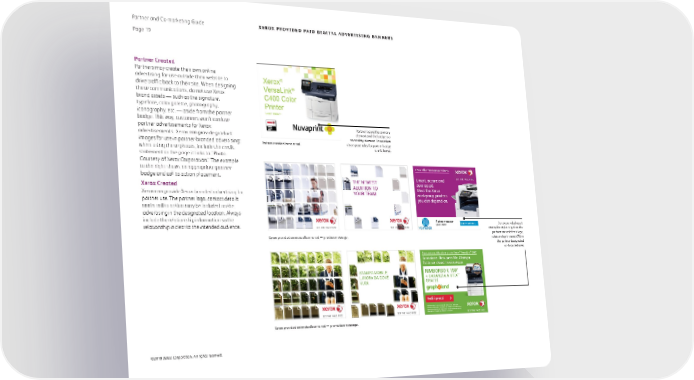 Partner and Co-marketing Guide Xerox PROVIDED PAID DIGITAL ADVERTISING BANNERS Page 19 Partner Created Partners may create their own online advertising for use outside their website to drive traffic back to their site. When designing these communications, do not use Xerox brand assets — such as the signature, typeface, color palette, photography, iconography, etc. — aside from the partner badge. This way, customers won’t confuse Document partner advertisements for Xerox Technology Partner logo is the primary Partner advertisements. Xerox can provide product element and the badge is a images for use in partner-branded advertising; secondary element. Ensure that Partner created banner ad. clear space rules for partner badge when using these photos, include the credit are followed. statement or the page it links to “Photo Courtesy of Xerox Corporation.” The example to the right shows an appropriate partner badge and call to action placement. Xerox Created Xerox can provide Xerox-branded advertising for partner use. The partner logo, contact details and a call to action may be included on the advertising in the designated location. Always include the relationship information so the Xerox provided asset relationship is clear to the intended audience. examples explaining that the partner can add their logo, Xerox provided animated banner ad — product message. relationship line and CTA in the partner designated co-branded area. Xerox provided animated banner ad — promotion message. ©2018 Xerox Corporation. All rights reserved.