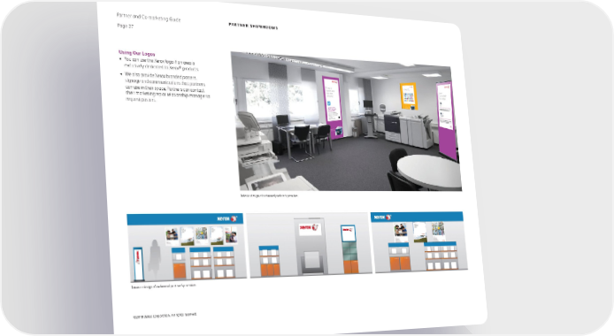 Partner and Co-marketing Guide partner showrooms Page 27 Using Our Logos • You can use the Xerox logo if an area is exclusively dedicated to Xerox® products. • We also provide Xerox branded posters, signage and communications that partners can use in their space. Partners can contact their marketing rep or relationship manager to request posters. Interior design of a channel partner’s premises Interior design of a channel partner's premises Interior design of a channel partner’s premises ©2018 Xerox Corporation. All rights reserved.