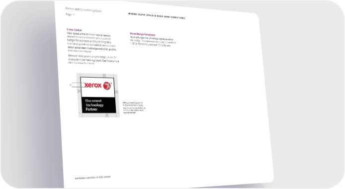 Partner and Co-marketing Guide BADGE CLEAR SPACE & LOGO LINE SIGNATURES Page 11 Clear Space Xerox Badge Variations Clear space is the minimum space needed Xerox only uses the 2-line logo signature within around Xerox brand assets such as partner the badge. The minimum size usage is a width of badges for optimum visibility and legibility. 1.10” or 28 mm for print and 121 px for web. Use these guidelines to establish the minimum distance between the badge and other graphic elements in the layout. Measure clear space using the height of the “X” character in the Xerox signature. See the example directly below for details. x Document When you need to place the Technology badge close to the company Partner logo, ensure that you follow the minimum clear space rule, as shown to the left. ©2018 Xerox Corporation. All rights reserved.
