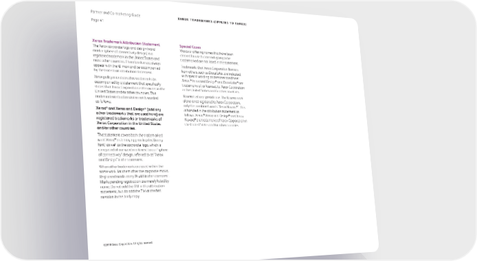 Partner and Co-marketing Guide Xerox Trademarks (applies to Xerox) Page 41 Xerox Trademark Attribution Statement Special Cases The Xerox corporate logo and design (word Words or offering names that have been mark + sphere of connectivity design) is a cleared for use but are not going to be registered trademark in the United States and trademarked are not listed in the statement. most other countries. Therefore it must always Trademarks that Xerox Corporation licenses appear with the ® mark and be accompanied from others, such as DocuColor, are indicated by the trademark attribution statement. with special wording as demonstrated here: ® ® ® Xerox policy mandates that trademarks be Xerox, Xerox and Design and DocuColor are accompanied by a statement that specifically trademarks of, or licensed to, Xerox Corporation states that Xerox Corporation is the owner in the in the United States and/or other countries. United States and/or other countries. This Nuvera is also a special case. The Nuvera mark trademark attribution statement is worded alone is not registered to Xerox Corporation, as follows: only the combined words “Xerox Nuvera®”. This Xerox® ® is handled in the attribution statement as and Xerox and Design [add any ® ® other trademarks that are used here] are follows: Xerox, Xerox and Design and Xerox registered trademarks or trademarks of Nuvera® are trademarks of Xerox Corporation in Xerox Corporation in the United States the United States and/or other countries. and/or other countries. This statement covers both the trademarked word Xerox® as it may appear in print (in any font) as well as the corporate logo, which is composed of our word mark next to our “sphere of connectivity” design, referred to as “Xerox and Design” in the statement. When other trademarks are used within the same work, list them after the corporate marks. Registered marks carry ® within the statement. Marks pending registration are merely listed by name. Do not add the TM in the attribution statement, but do add the TM at the first mention in the body copy . ©2018 Xerox Corporation. All rights reserved.