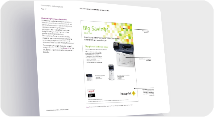 Partner and Co-marketing Guide PARTNER CREATED Print Advertising Page 17 Maintaining Company Separation Partners may create their own print advertising. When designing these communications, do not use Xerox brand assets — such as the signature, Partner branded typeface, color palette, photography, look and feel. iconography, etc. — aside from the partner badge. This way, customers won’t confuse partner advertisements for Xerox advertisements. Xerox can provide product images for use in partner-branded advertising; when using these photos, include the credit statement “Photo Courtesy of Xerox Corporation.” The example to the right reflects the general badge use guidelines noted on [pages 9-14]. This is suggested placement based on this partner’s branding. Use only Xerox provided product photography. The partner logo is the primary element and the badge is the secondary. Ensure that clear space rules for partner badge are followed. ©2018 Xerox Corporation. All rights reserved. Note: Partner created materials should reflect the partner’s corporate style and include the partnership badge.