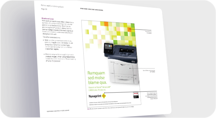 Partner and Co-marketing Guide PARTNER CREATED brochure Page 20 Brochure Cover With each collateral piece, make it clear who is speaking. On partner created pieces, use the partner voice and branding. Even if you’re Partner branded promoting Xerox® products, always use the look and feel. partner badge instead of the Xerox signature to ensure customers understand who they’re doing business with. Two other considerations: • Make sure the partner brand is the focal point in all applications; the badge should always be smaller than partner logos. Just be sure the badge isn’t so small that it becomes illegible. • Partners may use Xerox-supplied photo for product imagery. When using these photos, include the credit statement “Photo Courtesy of Xerox Corporation.” Use only Xerox provided product Rumquam photography. sed molse blame qua. Harum re Xerox® VersaLink® C400 Color Printer et. Partner logo is the primary element and the badge is a Document Solution Provider secondary element. Ensure that Technology Partner clear space rules for partner badge are followed. Os el dolorem veliqui piscin vel enismolore. Feu faciduisl dolestrud ming eum ea commolestie vent ©2018 Xerox Corporation. All rights reserved. Xerox® and VersaLink® are trademarks of Xerox Corporation in the United States and/or other countries. ©2018 Xerox Corporation. All rights reserved. Note: Partner created materials should reflect the partner’s corporate style and include the partnership badge.