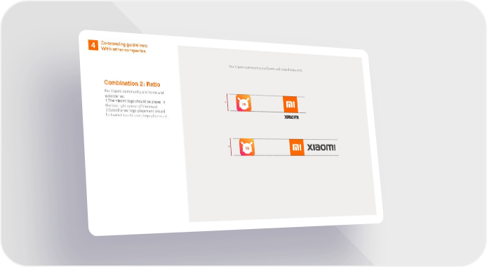 Co-branding guidelines: With other companies 4 X X For Xiaomi community platforms and subsidiaries only For Xiaomi community platforms and subsidiaries: 1:The Xiaomi logo should be placed in the top right corner of the visual. 2:Subsidiaries’ logo placement should be lower than Xiaomi’s logo placement.