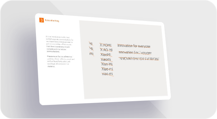 innovation for everyone Innovation For Everyone INNOVATION FOR EVERYONE MI Mi mi XIAOMI XIAO MI XiaoMI xiaomi Xiao Mi Xiao mi xiao mi Rules of writing It is extremely important to have unified corporate communications for our Xiaomi brand. Hence, we need to put in conscientious effort ensuring that there is consistency in both domestic and international communications. Please ensure that you adhere to all guidelines listed in this document, and unify all brand fonts, colors, and wording in all communication materials.