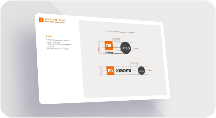 LOGO LOGO Ratio Co-branding guidelines: With other companies 4 X X X X When both companies’ logos are placed together: Centred Centred When both companies’ logos are placed side-by-side: 1:The Xiaomi logo should be placed on the le. 2:Both logos should be aligned.