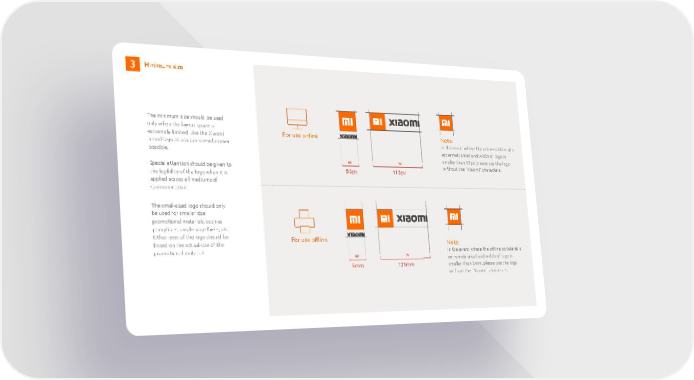 Note: In the event where the online collateral is extremely small and width of logo is smaller than 53px, please use the logo without the “Xiaomi” characters. Note: In the event where the oine collateral is extremely small and width of logo is smaller than 6mm, please use the logo without the “Xiaomi” characters. Minimum size 3 For use online For use oine The minimum size should be used only when the layout space is extremely limited. Use the Xiaomi brand logo at a larger size whenever possible. Special attention should be given to the legibility of the logo when it is applied across all mediums of communication. The small-sized logo should only be used for smaller size promotional materials, such as pamphlets, single page flyers, etc. Other uses of the logo should be based on the actual size of the promotional material.