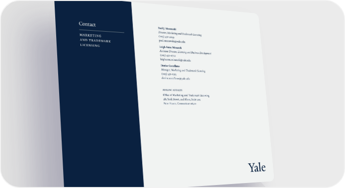 Paul J. Murawski Contact Director, Marketing and Trademark Licensing marketing (203) 432-4659 [email protected] and trademark Leigh Anne Minutoli licensing Assistant Director, Licensing and Business Development (203) 432-0710 [email protected] Denise Castellano Manager, Marketing and Trademark Licensing (203) 432-2313 [email protected] mailing address OfÏce of Marketing and Trademark Licensing 282 York Street, 2nd Floor, Suite 202 New Haven, Connecticut 06510 •
