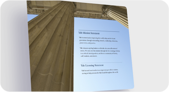 Yale Mission Statement Yale is committed to improving the world today and for future generations through outstanding research, scholarship, education, preservation, and practice. Yale educates aspiring leaders worldwide who serve all sectors of society. We carry out this mission through the free exchange of ideas in an ethical, interdependent, and diverse community of faculty, staff, students, and alumni. Yale Licensing Statement Yale licensed merchandise is an important part of this mission, serving to help promote the Yale brand throughout the world.