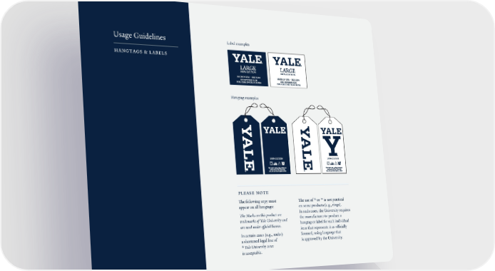 Usage Guidelines Label examples hangtags & labels Hangtag examples please note The following copy must The use of ® or ™ is not practical appear on all hangtags: on some products (e.g., rings). The Marks on this product are In such cases, the University requires trademarks of Yale University and the manufacturer to produce a are used under ofÏcial license. hangtag or label for each individual item that represents it as ofÏcially In certain cases (e.g., socks) licensed, using language that a shortened legal line of is approved by the University. ® Y ale University 20xx is acceptable.