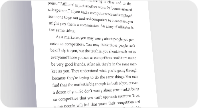 130 You Have a Book in You Create Partnerships and A昀케liates My friend Rick Dearr is an Internet marketing expert and the author of three best- selling books. Rick’s description of a昀케liate marketing is clear and to the point: “‘A昀케liate’ is just another word for ‘commissioned salesperson.’” If you had a computer store and employed someone to go out and sell computers to businesses, you might pay them a commission. An army of a昀케liates is the same thing. As a marketer, you may worry about people you per- ceive as competitors. You may think those people can’t be of help to you, but the truth is, you should reach out to everyone! 吀栀ose you see as competitors could turn out to be very good friends. After all, they’re in the same mar- ket as you. 吀栀ey understand what you’re going through because they’re trying to do the same things. You may 昀椀nd that the market is big enough for both of you, or even a dozen of you. So don’t worry about your market being so competitive that you can’t approach everyone. True, some people will feel that you’re their competition and won’t want to help. 吀栀at’s OK. But others will see the big picture. 吀栀ey’re going to help you because they’re going to bene昀椀t as well. 吀栀e basic idea of a昀케liate marketing is this: you part- ner with a trusted source who then campaigns for you