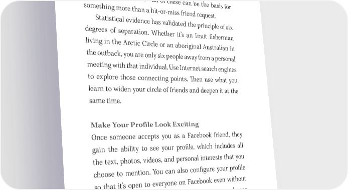 204 You Have a Book in You where you can learn about them. 吀栀en Google the name, and follow up on whatever information you 昀椀nd. It’s amazing how often you’ll discover many meeting points. Schools attended, companies worked for, cities lived in, sports teams followed—all of these can be the basis for something more than a hit- or- miss friend request. Statistical evidence has validated the principle of six degrees of separation. Whether it’s an Inuit 昀椀sherman living in the Arctic Circle or an aboriginal Australian in the outback, you are only six people away from a personal meeting with that individual. Use Internet search engines to explore those connecting points. 吀栀en use what you learn to widen your circle of friends and deepen it at the same time. Make Your Pro昀椀le Look Exciting Once someone accepts you as a Facebook friend, they gain the ability to see your pro昀椀le, which includes all the text, photos, videos, and personal interests that you choose to mention. You can also con昀椀gure your pro昀椀le so that it’s open to everyone on Facebook even without a friendship connection (I de昀椀nitely suggest you choose that option). After all, you have nothing to hide. On the contrary, you want the world to 昀椀nd out about you, and the sooner the better. Creating your Facebook pro昀椀le can be a fun and interesting task. Accept the constraints of its template—