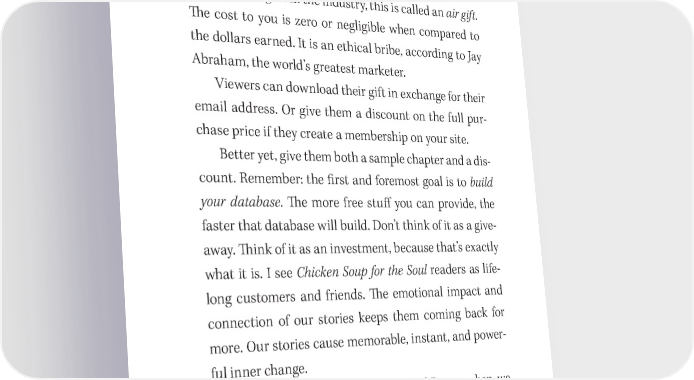 Marketing Your Best Seller 105 thing in return? 吀栀at’s why you should o昀昀er something for free: a sample chapter of your book, a special article, tickets to your seminar or event, a group conversation, a private and exclusive event, or a small but meaningful and desirable gift. In the industry, this is called an air gift. 吀栀e cost to you is zero or negligible when compared to the dollars earned. It is an ethical bribe, according to Jay Abraham, the world’s greatest marketer. Viewers can download their gift in exchange for their email address. Or give them a discount on the full pur- chase price if they create a membership on your site. Better yet, give them both a sample chapter and a dis- count. Remember: the 昀椀rst and foremost goal is to build your database. 吀栀e more free stu昀昀 you can provide, the faster that database will build. Don’t think of it as a give- away. 吀栀ink of it as an investment, because that’s exactly what it is. I see Chicken Soup for the Soul readers as life- long customers and friends. 吀栀e emotional impact and connection of our stories keeps them coming back for more. Our stories cause memorable, instant, and power- ful inner change. Bob Allen and I melted down Je昀昀 Bezos, when we watched him challenge us on TV by saying: “No one can sell more books than Amazon can deliver.” Bob had just been enormously successful with his challenge for his book Nothing Down. Bob had said, “Send me to any city, and I will buy $1 million worth of real