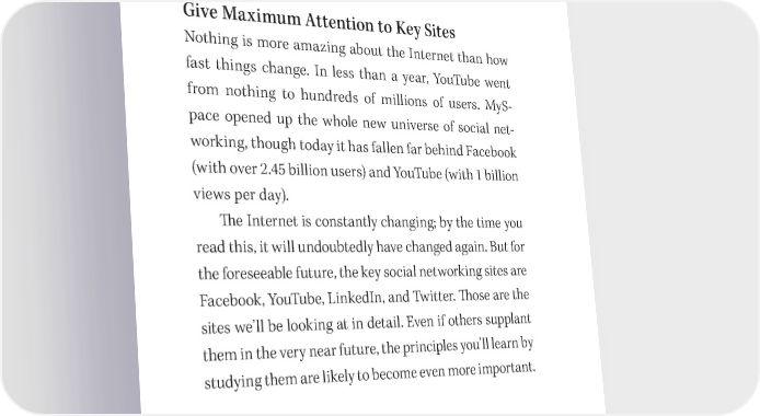 200 You Have a Book in You your selling for you. You can inspire electronic word- of- mouth advertising that will be much more e昀昀ective than any selling you could do on your own. Give Maximum Attention to Key Sites Nothing is more amazing about the Internet than how fast things change. In less than a year, YouTube went from nothing to hundreds of millions of users. MyS- pace opened up the whole new universe of social net- working, though today it has fallen far behind Facebook (with over 2.45 billion users) and YouTube (with 1 billion views per day). 吀栀e Internet is constantly changing; by the time you read this, it will undoubtedly have changed again. But for the foreseeable future, the key social networking sites are Facebook, YouTube, LinkedIn, and Twitter. 吀栀ose are the sites we’ll be looking at in detail. Even if others supplant them in the very near future, the principles you’ll learn by studying them are likely to become even more important. Facebook: 2.45 Billion Users! Facebook’s business model is based on building traf- 昀椀c. Plain and simple, it’s about getting as many users as possible. It’s a party, not a trade show. Toward that end, Facebook is designed to prevent people from turn-
