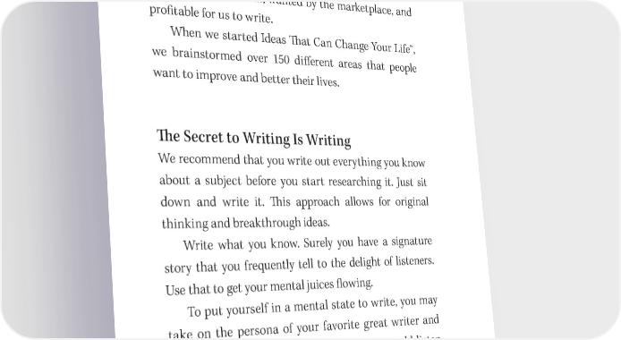 256 How to Fast Write a Book and Make a Fortune Include areas of interest you’d like to write about. Plan to review and add to this list regularly. When Jack and I started, we once sat in my Jacuzzi for hours and wrote out 137 titles that we thought would be fun, easy, bene昀椀cial, wanted by the marketplace, and pro昀椀table for us to write. When we started Ideas 吀栀at Can Change Your Life™, we brainstormed over 150 di昀昀erent areas that people want to improve and better their lives. 吀栀e Secret to Writing Is Writing We recommend that you write out everything you know about a subject before you start researching it. Just sit down and write it. 吀栀is approach allows for original thinking and breakthrough ideas. Write what you know. Surely you have a signature story that you frequently tell to the delight of listeners. Use that to get your mental juices 昀氀owing. To put yourself in a mental state to write, you may take on the persona of your favorite great writer and tap into vibrations of their energy, or you could listen to music that nourishes your creativity. We all love Pachelbel’s Canon in D, which allows us to write for hours on end. Don’t try to be perfect. Remember, nobody ever pub- lishes their 昀椀rst draft!