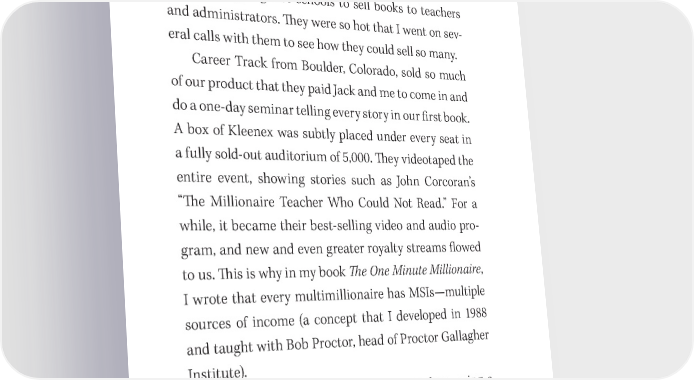 74 You Have a Book in You and Fred Pryor Seminars.) To paraphrase the Bible, once you seek, you will 昀椀nd many and varied opportunities to retail and wholesale your books. Reading Is Fun from Fair昀椀eld, Iowa, had teams of salespeople going into schools to sell books to teachers and administrators. 吀栀ey were so hot that I went on sev- eral calls with them to see how they could sell so many. Career Track from Boulder, Colorado, sold so much of our product that they paid Jack and me to come in and do a one- day seminar telling every story in our 昀椀rst book. A box of Kleenex was subtly placed under every seat in a fully sold- out auditorium of 5,000. 吀栀ey videotaped the entire event, showing stories such as John Corcoran’s “吀栀e Millionaire Teacher Who Could Not Read.” For a while, it became their best- selling video and audio pro- gram, and new and even greater royalty streams 昀氀owed to us. 吀栀is is why in my book 吀栀e One Minute Millionaire, I wrote that every multimillionaire has MSIs—multiple sources of income (a concept that I developed in 1988 and taught with Bob Proctor, head of Proctor Gallagher Institute). One of our early breakthroughs was discovering a catalogue of catalogues. It was a catalogue that listed all the other catalogues that sold anything and everything. We wrote letters to all three hundred publications listed, and we made it into many of them. 吀栀e one that is most