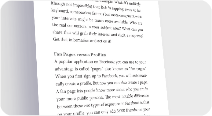 212 You Have a Book in You connectors can take some research and persistence. Still, if your message gets a response from Bob Dylan, thou- sands of people are going to see it if you’ve con昀椀gured your privacy setting to “open.” Bob Dylan is an extreme example. While it’s unlikely (though not impossible) that Bob is tapping away at his keyboard, someone less famous but more congruent with your interests might be much more available. Who are the real connectors in your subject area? What can you share that will grab their interest and elicit a response? Get that information and act on it! Fan Pages versus Pro昀椀les A popular application on Facebook you can use to your advantage is called “pages,” also known as “fan pages.” When you 昀椀rst sign up to Facebook, you will automati- cally create a pro昀椀le. But now you can also create a page. A fan page lets people know more about who you are in your more public persona. 吀栀e most notable di昀昀erence between these two types of exposure on Facebook is that on your pro昀椀le, you can only add 5,000 friends; on your page, an in昀椀nite number of people can become your fans, and you can update them about whatever you are up to. Many authors use fan pages to tell readers about their book releases and book tours. You can also post fun tid- bits: quizzes related to your subject, or bonus chapters to your books to entice people.