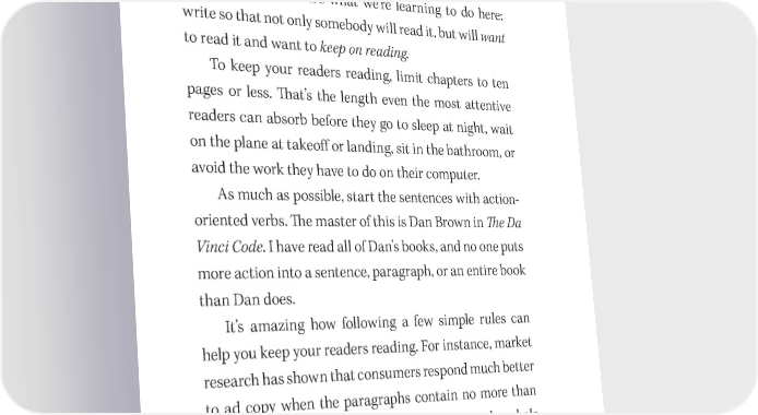 54 You Have a Book in You Keep Paragraphs Short Ernest Hemingway said that writing was easy; it only became di昀케cult if you expected somebody else to read what you wrote. 吀栀at’s what we’re learning to do here: write so that not only somebody will read it, but will want to read it and want to keep on reading. To keep your readers reading, limit chapters to ten pages or less. 吀栀at’s the length even the most attentive readers can absorb before they go to sleep at night, wait on the plane at takeo昀昀 or landing, sit in the bathroom, or avoid the work they have to do on their computer. As much as possible, start the sentences with action- oriented verbs. 吀栀e master of this is Dan Brown in 吀栀e Da Vinci Code. I have read all of Dan’s books, and no one puts more action into a sentence, paragraph, or an entire book than Dan does. It’s amazing how following a few simple rules can help you keep your readers reading. For instance, market research has shown that consumers respond much better to ad copy when the paragraphs contain no more than eight lines. It doesn’t really matter how long the whole ad is. In fact, longer ads are usually better. (吀栀e best long form copywriter is Jay Abraham, my great friend and the man with whom I share the same birth date as Elvis Pres- ley.) But within the document, the paragraphs must con- form to the eight- line limit.