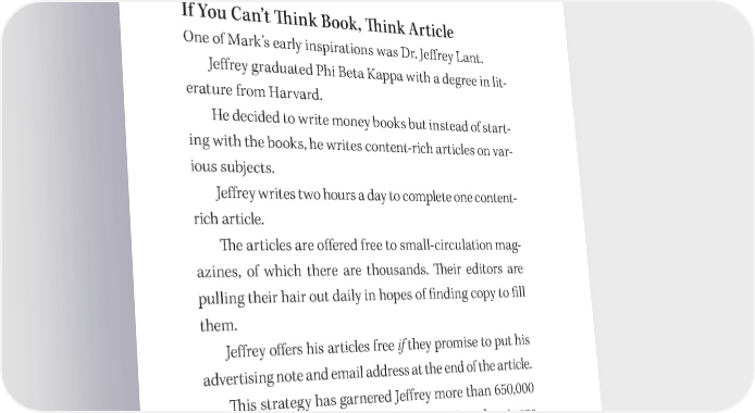258 How to Fast Write a Book and Make a Fortune is practically impossible to comprehend and makes it easy for the masses to understand and employ. Bob is a millionaire- maker. If You Can’t 吀栀ink Book, 吀栀ink Article One of Mark’s early inspirations was Dr. Je昀昀rey Lant. Je昀昀rey graduated Phi Beta Kappa with a degree in lit- erature from Harvard. He decided to write money books but instead of start- ing with the books, he writes content- rich articles on var- ious subjects. Je昀昀rey writes two hours a day to complete one content- rich article. 吀栀e articles are o昀昀ered free to small- circulation mag- azines, of which there are thousands. 吀栀eir editors are pulling their hair out daily in hopes of 昀椀nding copy to 昀椀ll them. Je昀昀rey o昀昀ers his articles free if they promise to put his advertising note and email address at the end of the article. 吀栀is strategy has garnered Je昀昀rey more than 650,000 friendly permission- marketed buyers. Je昀昀rey then turns the same article into a special report, which he sells online for $7. 吀栀is is handled by an autoresponder, so he has no hard costs for printing to worry about, no agent, pub- lisher, or anything else—just a money machine.