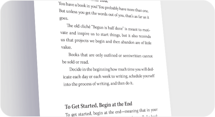 You Have a Book in You! You have a book in you! You probably have more than one. But unless you get the words out of you, that’s as far as it goes. 吀栀e old cliché “Begun is half done” is meant to moti- vate and inspire us to start things, but it also reminds us that projects we begin and then abandon are of little value. Books that are only outlined or semiwritten cannot be sold or read. Decide in the beginning how much time you will ded- icate each day or each week to writing, schedule yourself into the process of writing, and then do it. To Get Started, Begin at the End To get started, begin at the end—meaning that in your mind’s eye, you must see a 昀椀nished product called a book. 吀栀ink about what your book will look like when it is done and who will read it. Whether your book is being written for a general audience for a speci昀椀c niche, make sure that your target