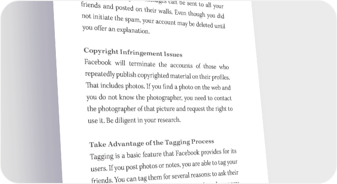 218 You Have a Book in You Beware of Phishing Scams If you receive a message from Facebook asking for your password or any personal information, do not respond. 吀栀is is a phishing scam—an attempt to capture your identity so that spam messages can be sent to all your friends and posted on their walls. Even though you did not initiate the spam, your account may be deleted until you o昀昀er an explanation. Copyright Infringement Issues Facebook will terminate the accounts of those who repeatedly publish copyrighted material on their pro昀椀les. 吀栀at includes photos. If you 昀椀nd a photo on the web and you do not know the photographer, you need to contact the photographer of that picture and request the right to use it. Be diligent in your research. Take Advantage of the Tagging Process Tagging is a basic feature that Facebook provides for its users. If you post photos or notes, you are able to tag your friends. You can tag them for several reasons: to ask their opinion, to get their suggestions, to let them know you mentioned them in a note or that they appear in a photo, or to share what you are up to. Tagging makes people feel included, and it shows up on your home page and theirs, which will start to spread your message and identity. Have fun with it!