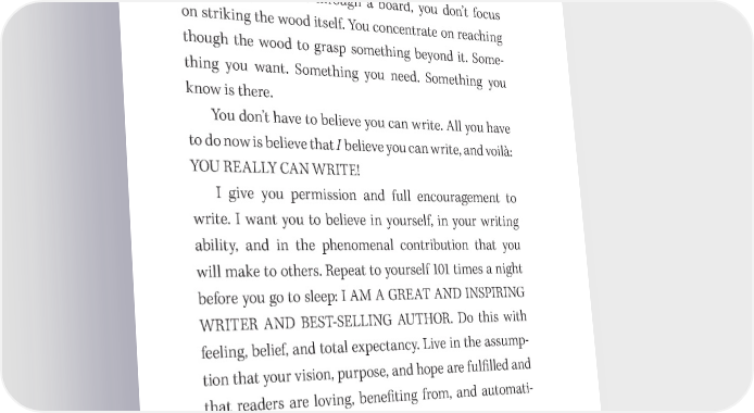 18 You Have a Book in You 吀栀e 昀椀rst step is certainty. Not just con昀椀dence, not just belief, but the absolute conviction that you have a book inside you that is going to be born. It’s the principle on which martial arts like karate are built. When you’re punching your hand through a board, you don’t focus on striking the wood itself. You concentrate on reaching though the wood to grasp something beyond it. Some- thing you want. Something you need. Something you know is there. You don’t have to believe you can write. All you have to do now is believe that I believe you can write, and voilà: YOU REALLY CAN WRITE! I give you permission and full encouragement to write. I want you to believe in yourself, in your writing ability, and in the phenomenal contribution that you will make to others. Repeat to yourself 101 times a night before you go to sleep: I AM A GREAT AND INSPIRING WRITER AND BEST- SELLING AUTHOR. Do this with feeling, belief, and total expectancy. Live in the assump- tion that your vision, purpose, and hope are ful昀椀lled and that readers are loving, bene昀椀ting from, and automati- cally sharing your writings. See yourself on the other side of the writing experi- ence, just as a karate master sees his hand pass on to the other side of the board before he makes a move. 吀栀at’s why we will keep saying live in your imagination, and start with the end in mind. See your best seller in detail and all