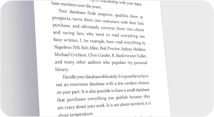 108 You Have a Book in You Your database contains the people who will also buy the next 昀椀ve books you write, attend your retreat, and enroll for your telecourse. Basically, your database can put your kids through college. But this will only happen if you maintain a meaningful relationship with your data- base members over the years. Your database 昀椀nds suspects, quali昀椀es them as prospects, turns them into customers with their 昀椀rst purchase, and ultimately converts them into clients and raving fans who want to read everything you have written. I, for example, have read everything by Napoleon Hill, Bob Allen, Bob Proctor, Sydney Sheldon, Michael Crichton, Clive Cussler, R. Buckminster Fuller, and many other authors who populate my personal library. Handle your database delicately. It is possible to burn out an enormous database with a few careless choices on your part. It is also possible to have a small database that purchases everything you publish because they are crazy about your work. It is not about numbers; it is about temperature. In the book business, we refer to your database as your list, and lists are either hot or cold. You want a hot list. In other words, you want to talk to your list on a reg- ular basis, providing tons of value, and continually build your list without seeing people unsubscribe from it.