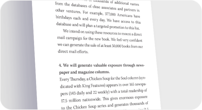 吀栀e One Minute Millionaire: A Marketing Plan 159 Nightingale/ Conant. He maintains a current mailing list of over 100,000 of these satis昀椀ed customers. 吀栀ey are per- fect buyers for this book. In addition to these databases, MVH and RGA have access to hundreds of thousands of additional names from the databases of close associates and partners in other ventures. For example, 377,000 Americans have birthdays each and every day. We have access to this database and will plan a targeted promotion to this list. We intend on using these resources to mount a direct mail campaign for the new book. We feel very con昀椀dent we can generate the sale of at least 50,000 books from our direct mail e昀昀orts. 4. We will generate valuable exposure through news- paper and magazine columns. Every 吀栀ursday, a Chicken Soup for the Soul column (syn- dicated with King Features) appears in over 165 newspa- pers (143 daily and 22 weekly) with a total readership of 17.5 million nationwide. 吀栀is gives enormous exposure to the Chicken Soup series and generates thousands of sales. In addition, Woman’s World weekly magazine (1.5 million readers) runs a syndicated Chicken Soup story. Building on this experience, we intend to launch a nationwide 昀椀nancial column called “吀栀e Millionaire Minute.” 吀栀e tagline will drive people to the One Minute Millionaire website, where people will be encouraged to