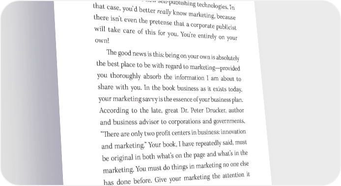 Marketing Your Best Seller 81 much as it hurts me to say it, this will often be true no matter how brilliant the content of your book might be. 吀栀at’s the book business, folks. But wait! Suppose you bypass the traditional route and use one of the new self- publishing technologies. In that case, you’d better really know marketing, because there isn’t even the pretense that a corporate publicist will take care of this for you. You’re entirely on your own! 吀栀e good news is this: being on your own is absolutely the best place to be with regard to marketing—provided you thoroughly absorb the information I am about to share with you. In the book business as it exists today, your marketing savvy is the essence of your business plan. According to the late, great Dr. Peter Drucker, author and business advisor to corporations and governments, “吀栀ere are only two pro昀椀t centers in business: innovation and marketing.” Your book, I have repeatedly said, must be original in both what’s on the page and what’s in the marketing. You must do things in marketing no one else has done before. Give your marketing the attention it deserves, which is a lot! Have Giant Goals and Believe in 吀栀em A verse in the Bible states, “Where there is no vision, the people perish” (Proverbs 29:19). I like to say: “With vision,