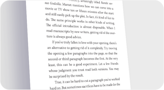Write a GREAT Book! 59 ter. Why? Because I have gotten warmed up, hot in tune and tone, and energized, and I can do an in昀椀nitely better job. It is the nature of writing and talking that makes it so. 吀栀e playwright David Mamet makes this point in his book on the 昀椀lm industry, amusingly titled Bambi ver- sus Godzilla. Mamet mentions how we can come into a movie or TV show ten or 昀椀fteen minutes after the start and still easily pick up the plot. In fact, it’s kind of fun to do. 吀栀e same principle works in other kinds of writing. 吀栀e o昀케cial introduction is almost disposable. When I read manuscripts by new writers, getting rid of the over- ture is always good advice. If you’ve truly fallen in love with your opening, there’s an alternative to getting rid of it completely. Try moving the opening a few paragraphs into the page, so that the second or third paragraph becomes the 昀椀rst. At the very least, this can be a good experiment. Let a few friends whose judgment you trust read both versions. You may be surprised by the result. True, it can be hard to cut a paragraph you’ve worked hard on. But sometimes sacri昀椀ces have to be made for the greater good! Nail the Table of Contents When people talk about getting lost in a book, that’s usually a good thing. 吀栀ey become so absorbed in what